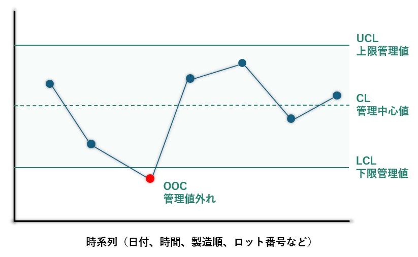 管理限界超え | データ点がUCLまたはLCLを超える | 測定ミス、設備異常、材料不良 |