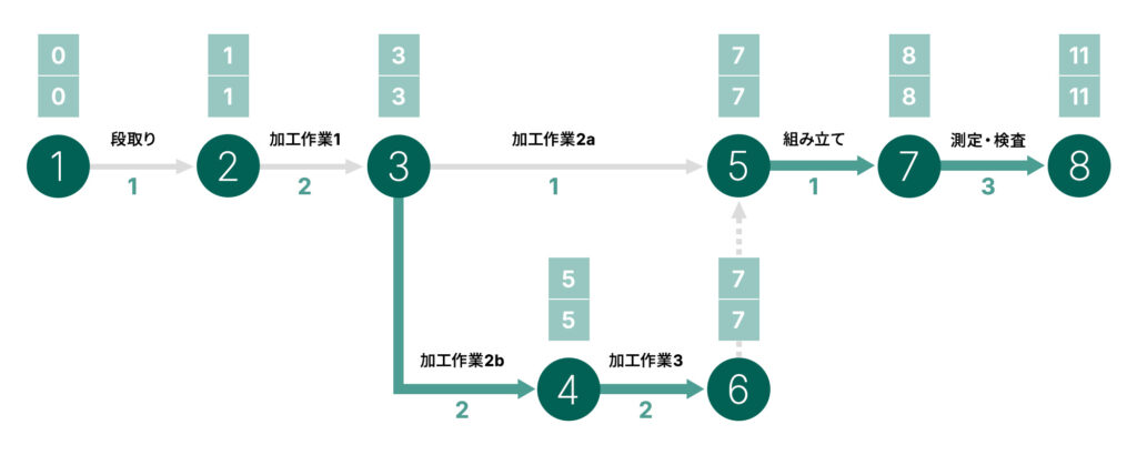 ネットワーク図ができたら、フォワードパス計算を実施します。これは、プロジェクトの開始点から順に前方向に計算を進め、各タスクの早期開始日(ES)と早期完了日(EF)を求める作業です。開始タスクのESをゼロとし、そのタスクの所要時間を加えてEFを算出します。次のタスクのESは、前工程のEFと同じ値となり(複数の前工程がある場合は最大値)、そこに所要時間を足してEFを求めます。