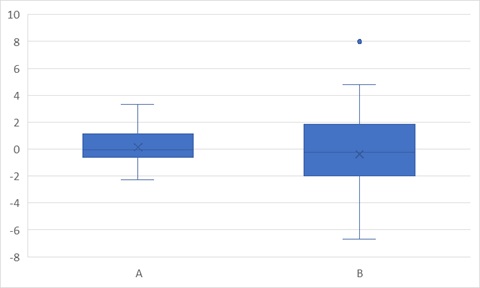上記のグラフの場合だと、AとBは平均値は似ているのですが、箱のサイズがBの方が大きいのでBの方がばらつきが大きく、Aとは異なる分布になっていることが分かります。