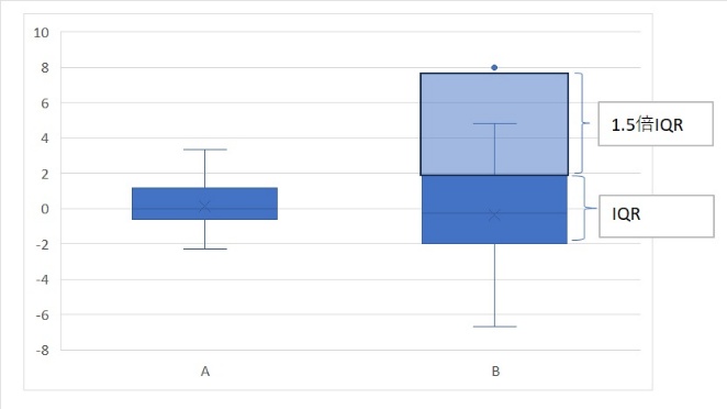 ちなみに、真ん中の×が平均値、箱のサイズがばらつき、箱から飛び出している棒が分布内の最大、最小値、棒から飛び出している点が外れ値(他の値よりかなり離れてポツンとあるような値)になります。