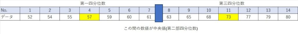 | 第二四分位数 (中央値) | データ群の下から50%の位置にある数字。 中央値ともいう | No. 7 と No. 8 の間/62 |