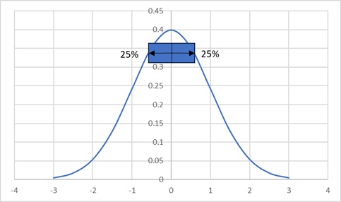 正規分布の中央から25%離れた場合の確率変数は何になるのか、正規分布表で確認してみましょう(図4)。