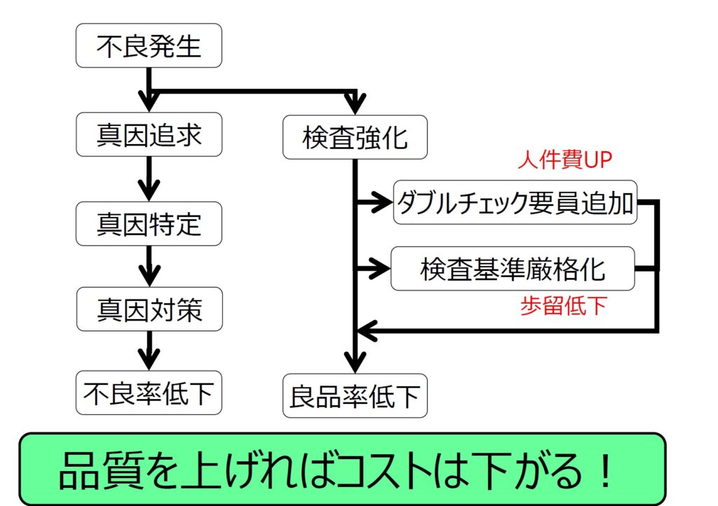 対して左側のルートを見てみてください。不良の真因を突き止めて、そこに対策を打てばその不良がなくなりますよね? これ、コストダウンしたというじゃないですか。真因が対策できるまでの期間、暫定的に右のルートで対応することは否定しません。しかし、いつまでも右側のルートで満足してしまうから「品質を上げるとコストも上がる」という誤解が生まれるのです。
