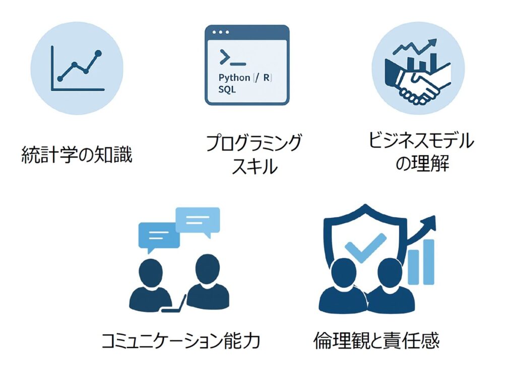 データサイエンティストに求められる能力は、先に述べたデータ選択能力に加え、以下のような複合的な能力が必要とされます。