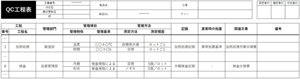 これらの項目を、工程の流れに沿って表形式で整理することで、工程全体の品質管理体制が一目で把握できるようになります。記載内容は、現場で実際に運用できる具体性と、社外説明にも対応できる分かりやすさを両立させることが求められます。